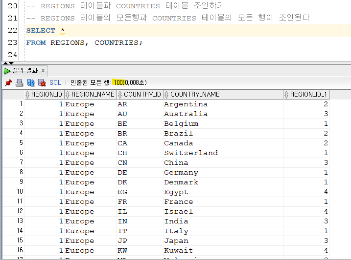 - 카티션곱은 조인조건을 지정하지 않고, 두 개 이상의 테이블을 조인하는 것이다